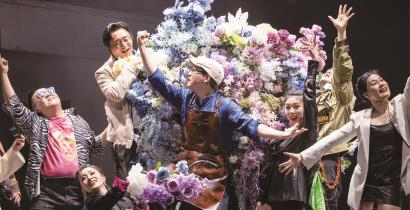 介于概念與敘事結構之間的《愛情神話》,是當下華語音樂劇的一次大膽嘗試,也是音樂劇人創作思維的一次跨越。這樣的拓展會使音樂劇的形式更具容量,可以承載更多現實題材,煥發更具有表現力的表演形態。而作為滬語音樂劇,該劇的演唱與對白中大量的滬語與滬普,也在復刻這座城市的迷人氣息。這里的海納百川,不只是接納了各地來的人,更是各種文化與觀念的對話,在應變與平衡中有容乃大。在我們身邊川流不息的人潮里,每個人都會有一己私見,私見經過沉淀也會轉為成見。而概念音樂劇總是在表現現象與觀念的同時,讓我們在各種成見與私見中找到自己前行的意義?!稅矍樯裨挕穭t通過老烏這一角色引出神話的概念,在他的故事中放大了人生中編織夢想的價值。所以,這部作品不只是討論愛情,也在討論人的存在。人,存在于過去與未來之間,存在于私見與成見之間,也可以存在于那個由自己編織的縹緲卻鮮活的神話世界里?!皟z就是則缺西”,是整部作品中最讓我動容的一句上海話,它帶著滑稽噱頭和神話意味,把人物身上一種面對困境,仍要笑著應對、堅毅向前的信念表達了出來。在川流不息中,找到一股涌動的精氣神。