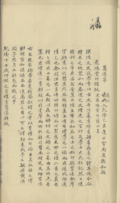頃得敝申號來函,述及老伯大人遺稿跋語,酌改后已送尊處。惟此跋公已付刊,因弟復加數語,又須耗損剞劂之資,心殊不安。寄來跋稿,弟覆閱一過,其中潘嶧琴學使“衍桐”兩字宜傍寫小字;又“嘗輯國朝一代之詩,名為《詩粹》”,“粹”當作“萃”;又“其他詩文詞稿草”,其“草”字宜刪去;又“承幹早孤,愴懷遺澤”,“早孤”兩字亦宜刪去。至于“民國三年”四字,前曾詢過筱珊丈,則為鈔胥誤寫,伊并未有此請,亦改去。其他陸純伯觀察一篇,姻兄亦嫌其俗,不如逕稱“部郎”或稱“徐君某某”,而“姻丈”改為“先生”,應不傷雅。均祈飭梓人照改為讬。(《求恕齋信稿》,第1523頁)