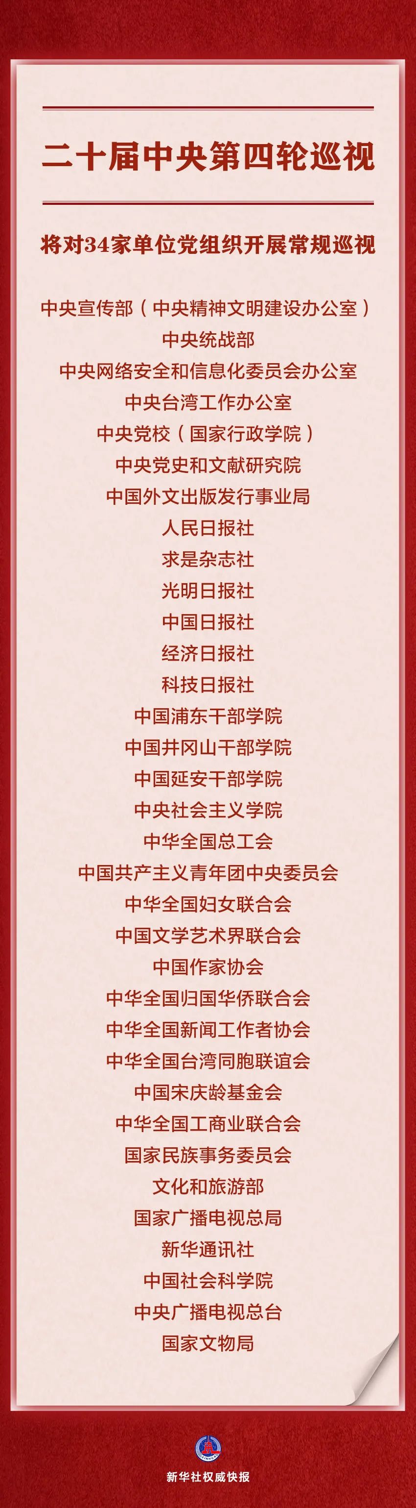 經黨中央批準,二十屆中央第四輪巡視將對中央宣傳部(中央精神文明建設辦公室)、中央統戰部、中央網絡安全和信息化委員會辦公室、中央臺灣工作辦公室、中央黨校(國家行政學院)、中央黨史和文獻研究院、中國外文出版發行事業局、人民日報社、求是雜志社、光明日報社、中國日報社、經濟日報社、科技日報社、中國浦東干部學院、中國井岡山干部學院、中國延安干部學院、中央社會主義學院、中華全國總工會、中國共產主義青年團中央委員會、中華全國婦女聯合會、中國文學藝術界聯合會、中國作家協會、中華全國歸國華僑聯合會、中華全國新聞工作者協會、中華全國臺灣同胞聯誼會、中國宋慶齡基金會、中華全國工商業聯合會、國家民族事務委員會、文化和旅游部、國家廣播電視總局、新華通訊社、中國社會科學院、中央廣播電視總臺、國家文物局等34家單位黨組織開展常規巡視。