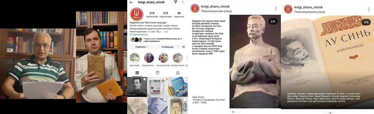 海外讀者反饋部分照片,其中左二是俄羅斯漢學家羅季奧諾夫展示的1929年出版的俄文版魯迅作品,右二是白俄羅斯藝術家扎伊爾·阿茲古爾制作的魯迅雕像