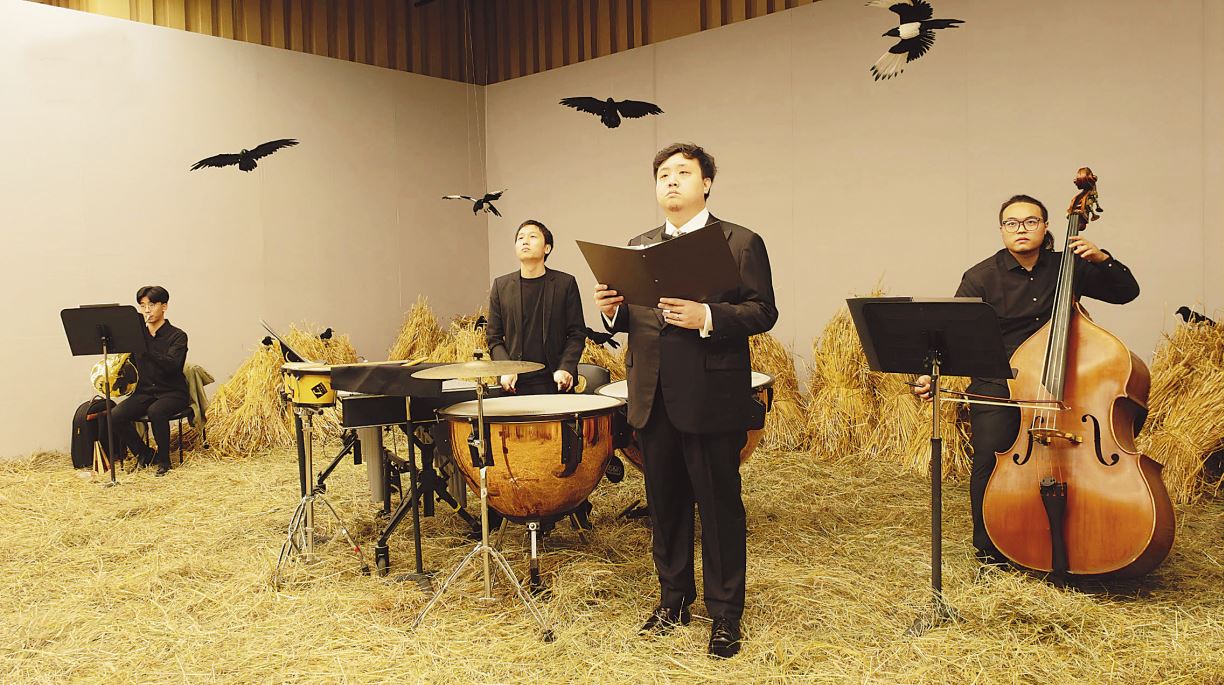 清晰流暢的旋律被切割分化,取而代之以大量的音束、音簇和音團、音塊,只能聽到片段式、動機式的音調。大二度連續上行像一串駁詰,大三度重復下行似一陣嘆息,純五度跳進更像壓抑中能量的積蓄爆發。十數人的室內樂隊,竟也揮灑點染出無比絢麗的豐富色彩!清晰完整的詠嘆調,徹底解構為碎片化的只言片語。歌聲大多包含元音與長音,而吟誦則多為《野草》原文的引用與化用。音樂和文辭,珠聯璧合如出一轍,凌厲如投槍直叫人靈魂出竅。