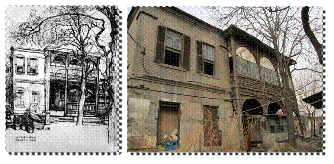 后來要講左翼文學,要講蕭軍的《八月的鄉村》,我就從我們學校圖書館借了這本書。很巧的是我借的這一版有一個蕭軍寫的“重版前記”,文末注明寫作地點是“北京銀錠橋西海北樓——‘蝸蝸’居寓所”。銀錠橋就是后海那邊嘛,我也去過啊,但我從來沒有留意過這個地方還有一處蕭軍故居。當時智能手機還不像現在這樣普及,我就上網查好地點,手繪了個簡單的地圖,還專門去找了一些資料,其中包括這幅畫,畫的就是蕭軍住的“蝸蝸”居。但到了實地后,找“蝸蝸”居特別費勁。資料顯示“蝸蝸”居是在鴉兒胡同,但是我前邊繞、后邊繞,怎么也沒有找到畫中的那棟樓,還想是不是已經拆掉了。正當我要放棄的時候,我一抬頭,發現前面有一個二層小樓,我看到的是樓的背面,而周圍都是平房,沒有二層的建筑,我就繞到前邊,有個大雜院,旁邊挨著個公共廁所,我從那個院門進去,往東一拐就看到一棟二層樓,再看它的陽臺、看它的窗戶,應該都是那種西洋風格的吧,和畫里畫的一樣,可以斷定這里就是蕭軍當年住過的“蝸蝸”居。當時那兒還沒有人攔著,是可以進到這個二樓里的,我也特別想進去看一看,但是我實在沒敢進去,因為這棟樓已經特別破、特別爛了,東邊的墻整面都沒有了,感覺隨時都有可能倒塌,我就怕樓塔了,把我埋在里面,我喊人都沒有人應。所以當時我也很詫異,因為印象里作家故居似乎都是被當作“文物保護單位”的,蕭軍是一位知名的作家,那為什么蕭軍的故居破成這樣?2023年夏天我又帶著學生去,“蝸蝸”居就已經被藍色彩鋼板給擋起來了,已經無法靠近了。這就是我最開始的兩次尋訪作家故居的經歷。