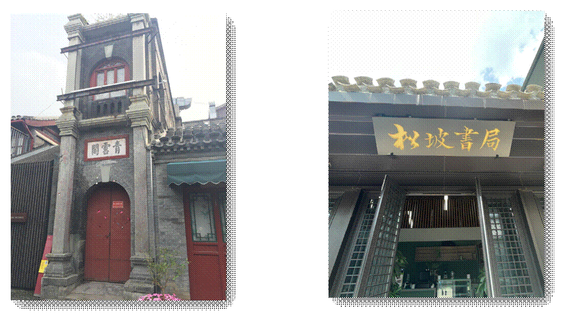 這張照片里的是青云閣,它在沈從文住過的楊梅竹斜街,當初是非常有名的商場。右邊這張照片里的是松坡書局,在西單漢光百貨背后。過去這里是民族大世界,是個小商品商場,就是賣箱包、皮帶之類的。今年夏天我剛又專門去看了看,現在這兒被作為蒙藏學校舊址重新對外開放。但這個位置上實際上值得留存的不止蒙藏學校舊址,還有松坡書局,梁啟超、徐志摩都和這里有關,所以能給松坡書局留個地方,這個保護我覺得還是很好的。