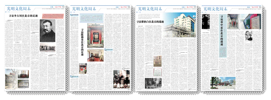 也正是在建黨百年的背景之下,2021年《光明日報》的一位編輯問我能不能寫寫李大釗或是陳獨秀,讓我選一個。我說那我寫李大釗吧,因為看過材料,也看過電視劇《覺醒年代》,尤其是去過他在文華胡同的故居。就這樣,以李大釗在北京的幾處故跡為線索,我寫了一篇《尋訪李大釗在北京的足跡》。后來,我想既然寫了李大釗,那索性就再寫篇尋訪陳獨秀的吧。寫完陳獨秀,一度想圍繞共產黨早期領導人做點文章,瞿秋白也在北京生活過,那再寫寫瞿秋白吧。寫完瞿秋白,順著這個思路,早期共產黨員我還能寫誰?因為我現在也在馬克思主義理論方向帶研究生,既應該也需要往這個方向靠一靠,于是就想著說李大釗、陳獨秀都是當時北大的老師們,那當時還有很多學生,于是又開始尋訪鄧中夏。這樣,到目前為止,一共完成了四篇尋訪“京畿紅跡”的文章,全都發在《光明日報》上。