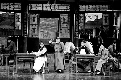 《茶館》劇照,左起:楊立新飾秦仲義,梁冠華飾王利發,濮存昕飾常四爺,馮遠征飾松二爺