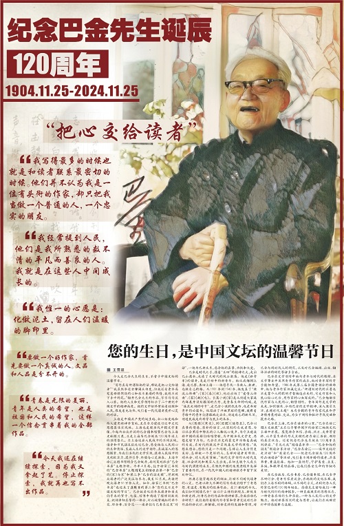 本月25日,我們迎來了巴金先生誕辰120周年,一系列紀念活動在全國各地展開。正如張宏森書記在巴金圖書館揭幕儀式上所言,巴金先生的一生是與時代同行的一生、為人民寫作的一生、為中國文學奉獻的一生。我們紀念巴金先生,正是希望秉持他的信念與精神繼續前行。