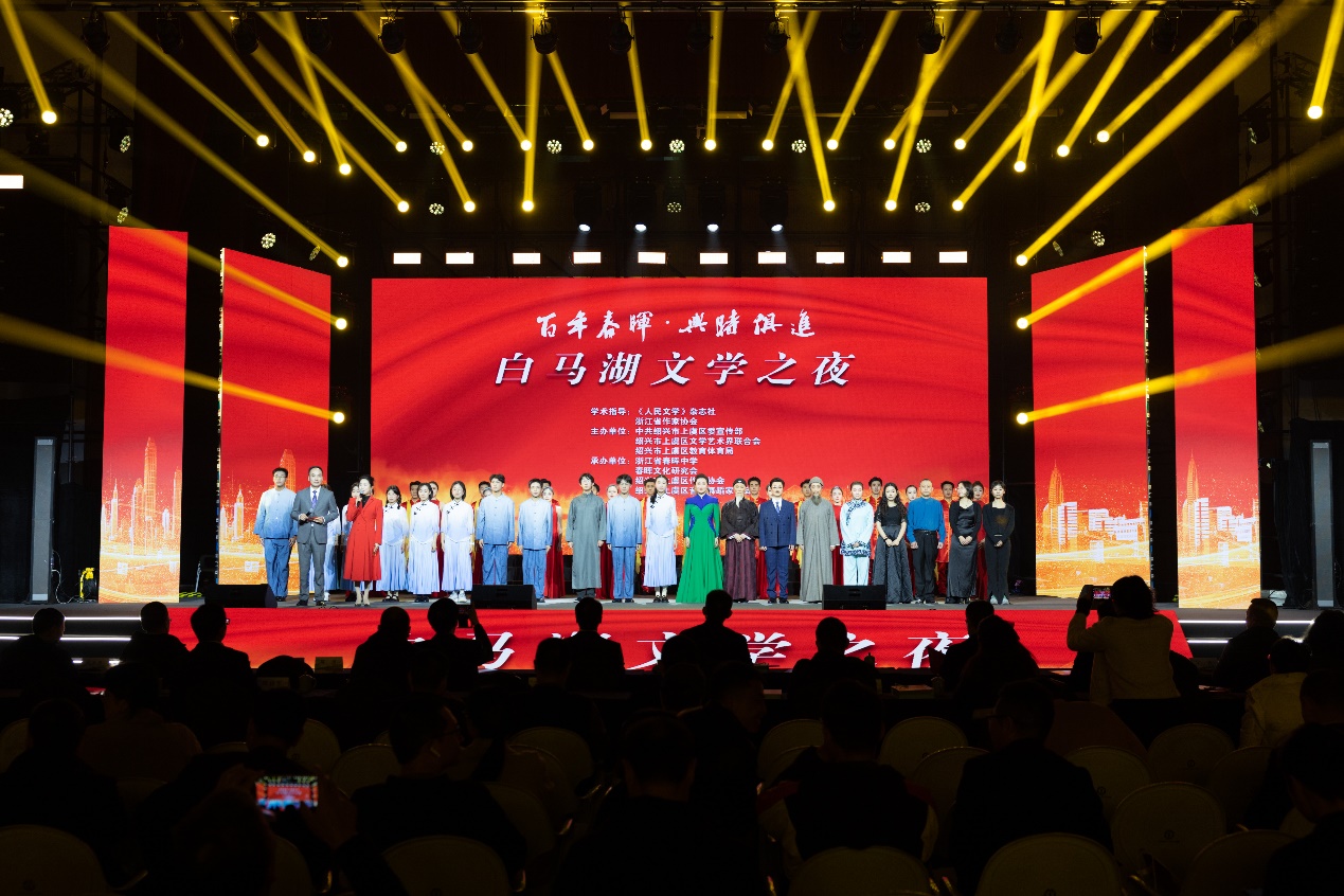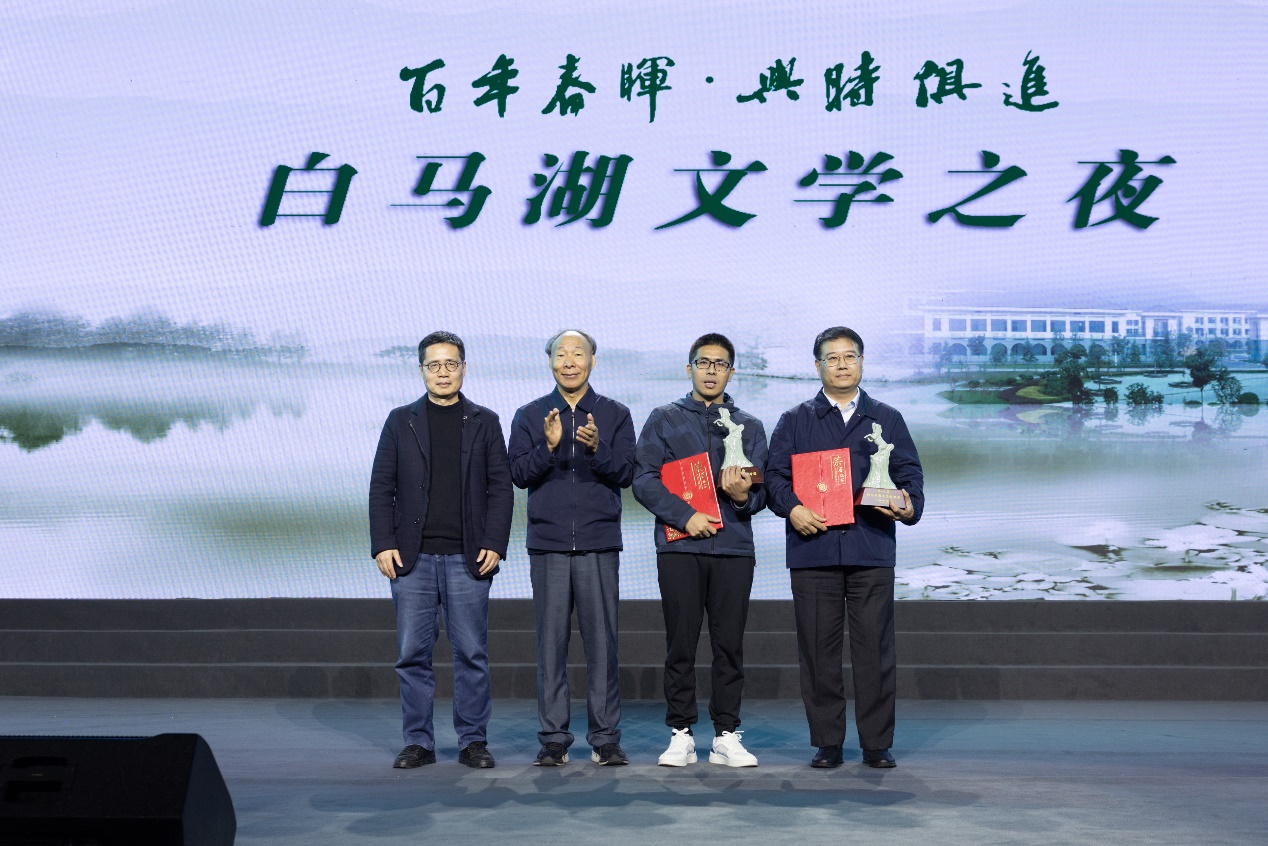 12月1日晚,首屆“白馬湖散文獎”頒獎暨“白馬湖文學之夜”活動在浙江百年名校春暉中學舉行。中國作協黨組成員、書記處書記、《人民文學》雜志社主編施戰軍,“白馬湖散文獎”評審委員會主任、中國作協副主席白庚勝,浙江省作協主席艾偉,紹興市副市長、上虞區委書記魯霞光出席并致辭?!度嗣裎膶W》雜志社副主編陳濤,老舍文學院專業作家寧肯,北京師范大學教授黃開發,紹興市委宣傳部副部長王洪海,上虞區人大主任陳堅,上虞區政協主席趙文中,上虞區委副書記李海裕,上虞區委常委、宣傳部長周曉國等一千多人參加活動。張煒、于堅、習習、李青松、阿舍、鮑堅、趙暢、周吉敏、王冰、李達偉等十名獲獎作家現場接受頒獎。