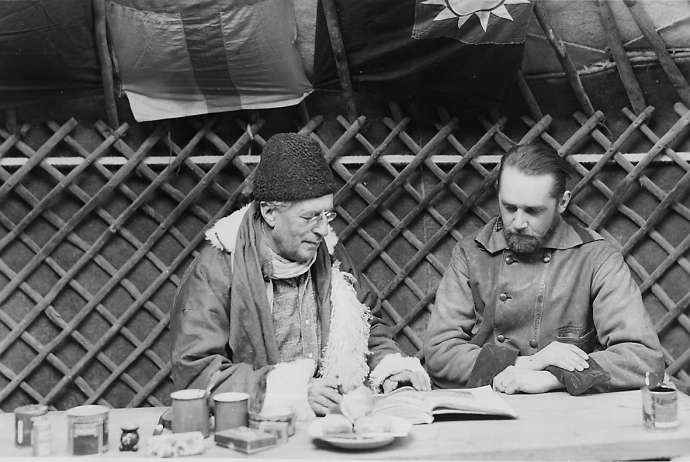 1934年左右,瑞典探險家斯文·赫定(左)與考古學家弗克·貝格曼(右)。圖自斯文·赫定基金會
