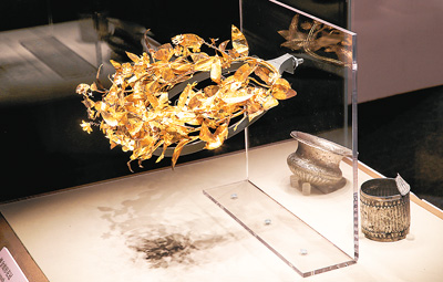 桃金娘形金花冠吸引了許多觀眾駐足欣賞。這件文物年代為公元前350年—公元前325年,制作工藝十分精湛。氣味芳香的桃金娘屬植物是女神阿佛洛狄忒的圣物,象征著不朽。在古希臘,黃金、鍍金和天然的花冠用于秘儀、祭祀、祭酒、宴會、賽會和戲劇有關的各類儀式。在馬其頓地區,黃金花冠作為死者的私人物品被放置在貴族墓葬中。