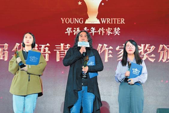 顧拜妮、包倬、龔萬瑩(從左至右)領取第九屆華語青年作家獎“中篇小說獎”。