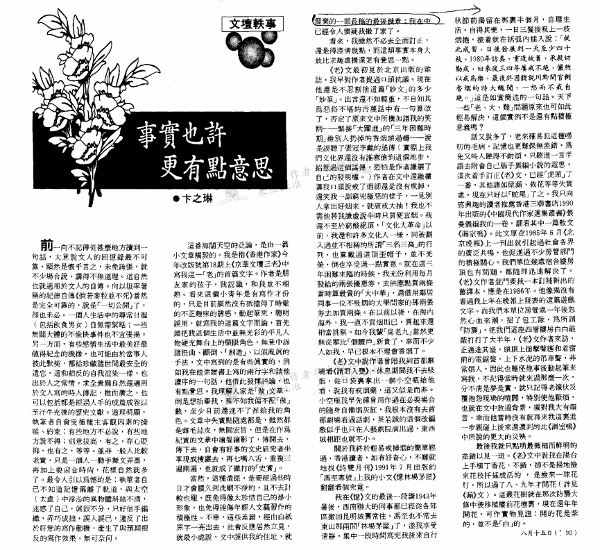 《事實》一文的第一段,即卞之琳先生自稱的“海闊天空的泛論”,談及文人的回憶錄“最不可靠”,存在刻意拔高,存心貶抑等狀況。不過,文章并未從文人回憶錄的不可靠或夸張深入下去,而是牽扯出一篇寫他的小文章,“失實點隨處都是”,讓他難安緘默。此文就是發表在《香港作家》1992年改版號十八期(1992年4月15日,總第四十二期)上的《京華文壇三老》中描寫卞之琳的“首篇文字”,作者為一個小青年,是“朋友家的孩子”、 “和我并不相熟”,“有寫作才份的,只是目前顯然沒有抵擋得了時髦的不正趣味的誘惑”。