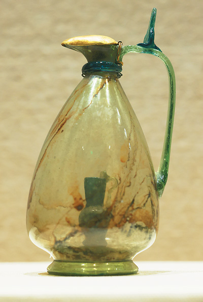 在遼寧省博物館“山河與共——遼金歷史文化主題文物展”現場,一個精美的遼代玻璃瓶吸引不少觀眾駐足欣賞。此瓶出土于遼寧省朝陽市北塔,輕薄晶透,瓶口似鳥首,柄柱似鳥尾,整體猶如一只昂首蹲坐的小鳥,瓶中還有一長頸弧腹小瓶,設計十分巧妙。據介紹,這件玻璃瓶產自波斯(今伊朗),反映了遼與西亞的經貿文化交流。