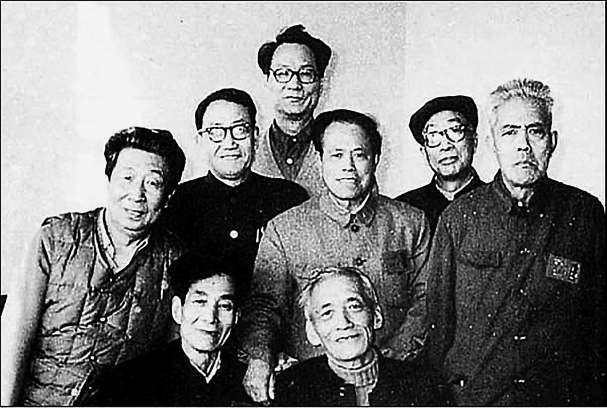 牛漢和朋友們(前排左起:魯藜、曾卓,后排左起:徐放、杜谷、牛漢、冀汸、綠原、路翎。1985年1月,北京)