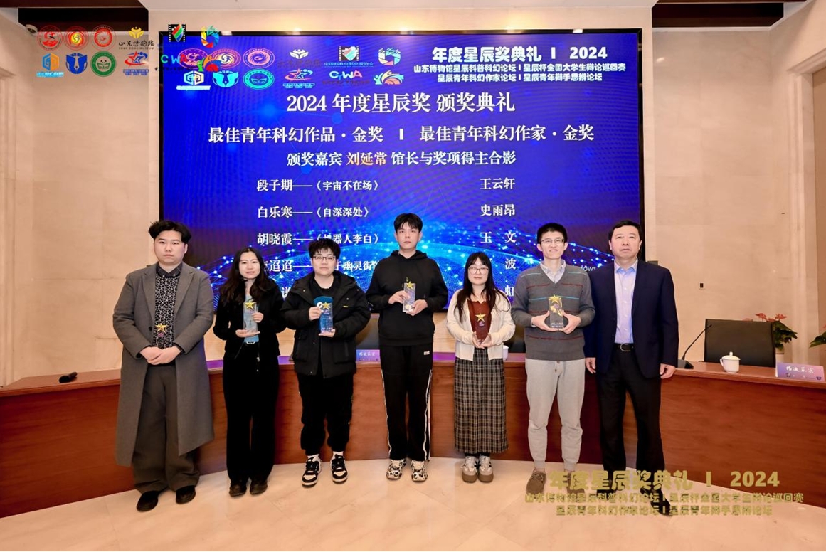 12月22日,2024博物館與科普科幻論壇暨年度星辰獎典禮系列活動在山東博物館學術報告廳舉行。本屆系列活動由中國文化產業協會文化元宇宙專委會科幻與未來科技發展研究中心、電子科技大學數字文化與傳媒研究中心主辦。山東博物館黨委書記、館長劉延常出席活動并致辭。電子科技大學數字文化與傳媒研究中心主任、中國文化產業協會文化元宇宙專委會副秘書長謝梅,中國大百科全書出版社副牌社知識出版社常務副社長張京濤,科幻作家超俠以及20余位獲獎作者與會。本屆系列活動包括2024博物館與科普科幻論壇、2024年度星辰獎頒獎典禮、2024星辰杯全國大學生辯論巡回賽·總決賽暨個人巔峰賽、星辰青年科幻作家論壇、星辰青年辯手思辨論壇等。