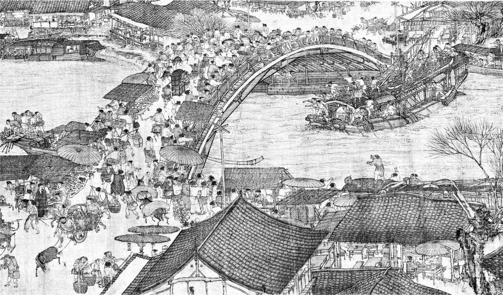 1825年,人類第一張被保存下來的感光影像是單色的;1839年,達蓋爾發明的銀版照相機也是單色圖像。盧米埃爾兄弟,在“19世紀的首都”巴黎發明電影,圖像是黑白、無聲的。而在十二世紀初的開封城內,張擇端制作的《清明上河圖》是遮幅彩色寬銀幕的移動膠片。畫卷每一處定格都是獨立構圖,每一處移動都是時間和空間上的定格?!肚迕魃虾訄D》,一直被模仿,從未被超越。