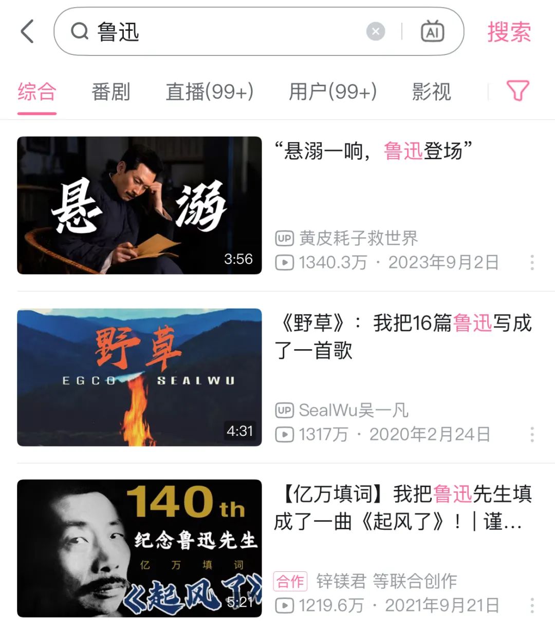 不過,倘若在站內搜索關鍵詞“魯迅”,前述以講解魯迅原作文章為主要內容的視頻,排名其實并不靠前。按熱度排序,標題內包含“魯迅”的短視頻中,播放量排在前三位的分別是“懸溺一響,魯迅登場”(1334.2萬)“《野草》:我把16篇魯迅寫成了一首歌”(1314.3萬)“【億萬填詞】我把魯迅先生填成了一曲《起風了》”(1215.7萬)。第一順位的視頻標題化用“懸溺一響,純愛登場”,內容是電影《覺醒年代》中魯迅相關片段混剪,配上“純愛向”影視劇情混剪常用的bgm(背景音樂)《懸溺》,強化“革命魯迅”的理想主義色彩,同時增添了一分青春浪漫的“偶像”氣質。第二、三順位的視頻都是音樂類二創作品,無論是將《野草》中的散文詩作品改編成歌詞,還是把作家為人為文的人生經歷改寫成歌詞,都是以魯迅作為素材進行的衍生創作。