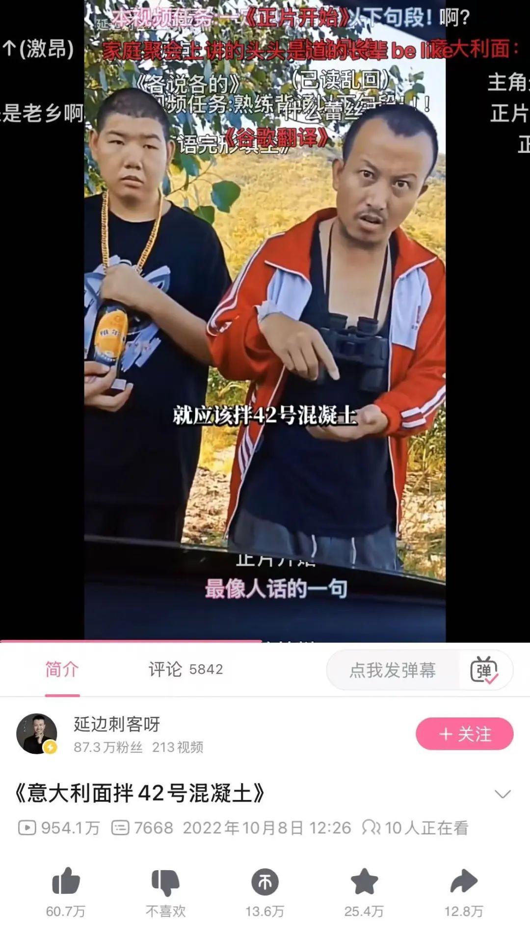 up主“延邊刺客”一條不到2分鐘的短視頻“意大利面拌42號混凝土”在B站播放量高達948.8萬,視頻中“意大利面就應該拌42號混凝土”“因為這個螺絲釘的長度很容易會影響到挖掘機的扭矩”等不明意味的對話,迅速成為二創視頻的混剪素材。隨后不久,另一則第三人稱視角拍攝的視頻“高速運轉的機械進入中國”被各平臺轉載,有人將其冠以“女版延邊刺客”之名。起初,網友在彈幕、評論或鬼畜、混剪中將這類視頻戲稱作“畢業論文的創新之處”“論文答辯現狀”或“公務員面試”,是因為視頻有意混合科技、政治、數學、文學、哲學等不同領域的專業用語,將其和日常生活話語糅雜在一起。讓人感覺說了什么,仿佛又什么都沒說,進而形成一種新的陌生化的表意效果。在某種意義上,“不明覺厲”“似懂非懂”“已讀亂回”的語言游戲就成為了“當代牛馬”療愈精神內耗的自我開解。