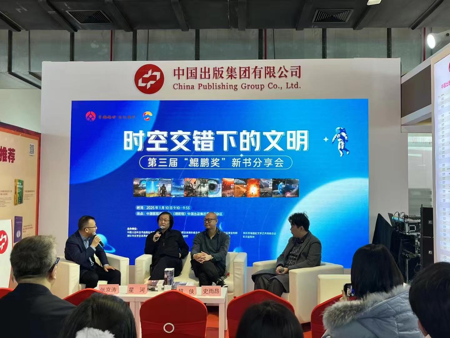 1月10日,“時空交錯下的文明:第三屆‘鯤鵬獎’新書分享會”在第37屆北京圖書訂貨會上舉行。中國作家協會科幻文學委員會委員、中國科普作家協會常務理事、科學文藝專業委員會主任星河,“鯤鵬獎”獲得者史雨昂等與會?!蚌H鵬獎”獲得者歐陽子毅和徐煒軒以視頻的方式參加活動?;顒佑芍R出版社常務副社長張京濤主持。
