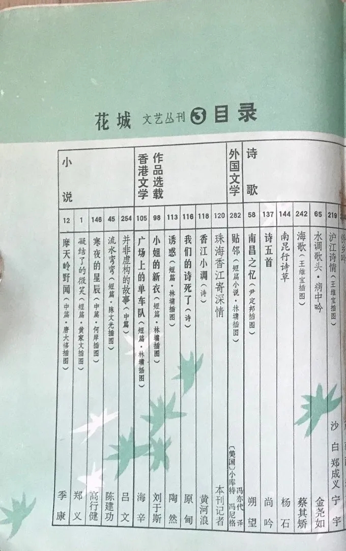 《花城》第三冊繼續“大放特放”,僅《香港文學作品選載》就登了五篇作品,并配上“本刊記者”文章《珠海香江寄深情》;在“香港通訊”欄目中,發表了曾敏之寫的《新加坡漢語文學掠影》;在“外國文學”欄目中,推出老翻譯家馮亦代翻譯的美國黑色幽默作家小庫特·馮尼格的小說《貼鄰》??吹贸鰜?,廣東確實在追求“百花齊放”,在“放”的膽識與程度上,領跑全國。