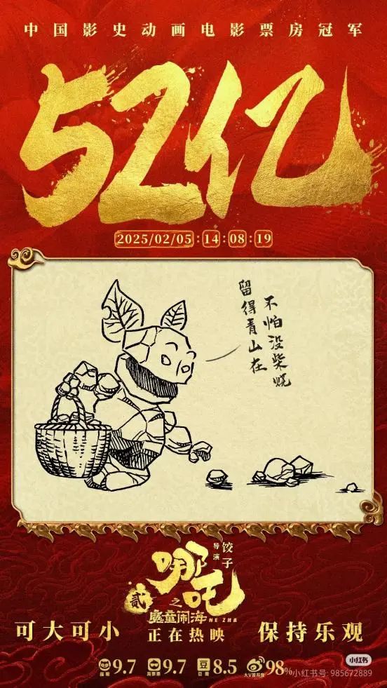 2025年春節期間,六部前期宣傳頗豐、影迷期盼已久的“重磅電影”同時上映,被稱為史上最強春節檔,競爭激烈可想而知。暌違五年,與偵探推理、神話史詩、武俠、軍事等各路強悍IP同場競技,作為中國影史動畫票房冠軍續作的《哪吒之魔童鬧?!穭萑缙浦?,粉碎“續作難出佳作”的魔咒,續寫了中國動畫影史的神話。據燈塔專業版數據顯示,截至2月6日,影片票房已突破58億元,超過《長津湖》成為中國影史票房第一,同時成為中國影史春節檔票房冠軍。與此同時,數據仍在不斷翻新當中,有網友戲稱,“吒兒的含金量還在不斷上升”,一盞茶的工夫,紀錄就有可能以億元為單位被不斷刷新。影片制作方之一彩條屋影業小紅書官方號甚至成為眾多影迷、網友“喊話”餃子導演的留言板,“正是拼的年紀,不能躺,快起來開拍哪吒三啦”。