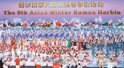 二月七日,第九屆亞洲冬季運動會開幕式在黑龍江省哈爾濱市舉行。圖為演員在開幕式上表演。新華社記者 楊 磊攝