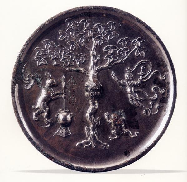圓形月宮鏡畫面組合的另外一種形式為:左嫦娥,中桂樹,右玉兔(蟾蜍),這種組合形式的月宮鏡發現數量相對較少。