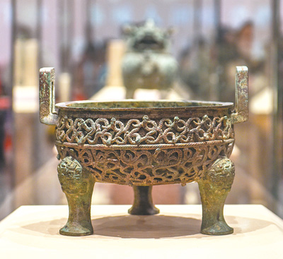 山西省石樓縣蘭家溝村出土的商代蛇首扁柄斗是目前國內發現最早的帶有蛇形象的青銅器。這是一件酒器,柄首飾蛙,蛙兩側有兩條弓身、卷尾的蛇。這種蛇與蛙組合的裝飾是北方系青銅器特有的題材,頗具草原文化色彩。山西省新絳縣橫橋鎮出土的春秋時期蟠蛇紋鏤空鼎,鼎腹有內外兩層,外層頸和底之間飾有兩周鏤空蟠蛇紋,群蛇蜿蜒游走,競相爭斗,動感十足。銅鼎外層鏤空鑄造群蛇是范鑄工藝難以做到的,是古代工匠用“失蠟法”鑄造銅器的最早范例之一。