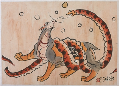 墓葬壁畫為了解古代社會提供了珍貴的圖像材料。礦物質顏料繪制的壁畫顏色經久不褪,畫中的蛇或出現在神話傳說場景里,或與人間煙火相伴,反映了古人豐富的想象力和精神信仰。山西忻州九原崗北朝壁畫墓中發現了鳥銜蛇和神獸銜蛇的圖案,象征著驅除升天途中的邪障,護佑墓主順利升天?!渡胶=洝酚涊d:“大荒之中,有山名曰北極天柜,海水北注焉……又有神,銜蛇操蛇,其狀虎首人身,四蹄長肘,名曰強良?!便暽邎D出現在墓葬中,也有鎮守墓室、庇護墓主人安寧的意義。山西右玉寶寧寺明代“大威德焰發德迦明王”水陸畫中的蛇形象與神佛相伴,庇佑人間。蛇在畫中不僅是一種裝飾,更體現了古人的精神寄托,希望借助蛇的神秘力量驅邪避災,保佑風調雨順、國泰民安。