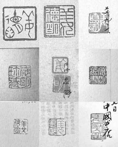 筆者收集姜德明鈐蓋于不同時期圖書上的印章,目前確認的共有九枚,分別是:1.姜德明(大篆寬邊朱文),2.德明珍藏(朱文),3.姜德明(朱文),4.姜德明(朱白相間),5.姜(大篆朱文)、德明(大篆白文),6.姜德明(朱白相間),7.姜德明(白文),8.德明藏書(白文),9.姜德明(豎式,朱文)。印章整體質量較好,以入印文字來看,從甲骨文、金文到小篆都有,且都是小印,像第—、第二、第五、第七枚稱得上精美。姜德明長期在《人民日報》副刊部執編“大地”副刊,有機會接觸到國內第一流文藝家,其中不少就以多藝多才著稱,還精于篆刻,如錢君匋、李白風、曹辛之等。姜德明的藏書章中,可能就有出自于他們之手的印章。另外,筆者還注意到姜德明在使用這些姓名章時,鈐蓋位置、印章大小、印泥大體還講究。不過,筆者也發現有些印章可能出于后人的追加,如鈐蓋在書尾的姓名章,與鈐蓋于書扉頁的印章重復,前人只有在書末寫題跋時才加蓋印章。而扉頁目錄頁或正文的反復鈐印也顯得疊床架屋。鈐印既是藏書家曾經收藏的紀錄,也接續了藏書文化中的優秀傳統,朱砂紅印鈐蓋在經過時間風化略略泛黃的紙上,增飾了書籍被”讀過”的美感,也顯示了藏書家的珍惜之心。