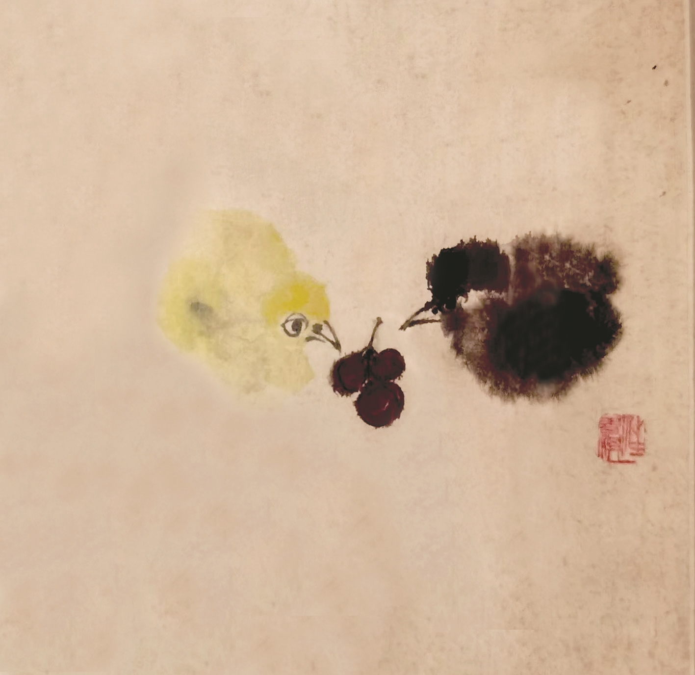 那是宗璞先生第一次向汪曾祺先生討畫:“不想一周內便來了一幅斗方。兩只小雞,毛茸茸的,歪著頭看一串紫紅色的果子,很可愛。果子似乎很酸,所以小雞在琢磨罷?!保ā度鶊D》)隨后,汪曾祺先生又給宗璞先生畫了一幅牡丹圖并題詩:“人間存一角,聊放側枝花,臨風亦自得,不共赤城霞?!贝送?,還有一幅水仙圖和一幅寫意荷花圖。