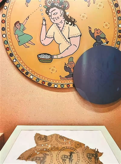 “絲綢的故事——古今中外再想象”展覽中展出的唐代黃地聯珠團窠鹿紋錦殘片和藝術家作品。
