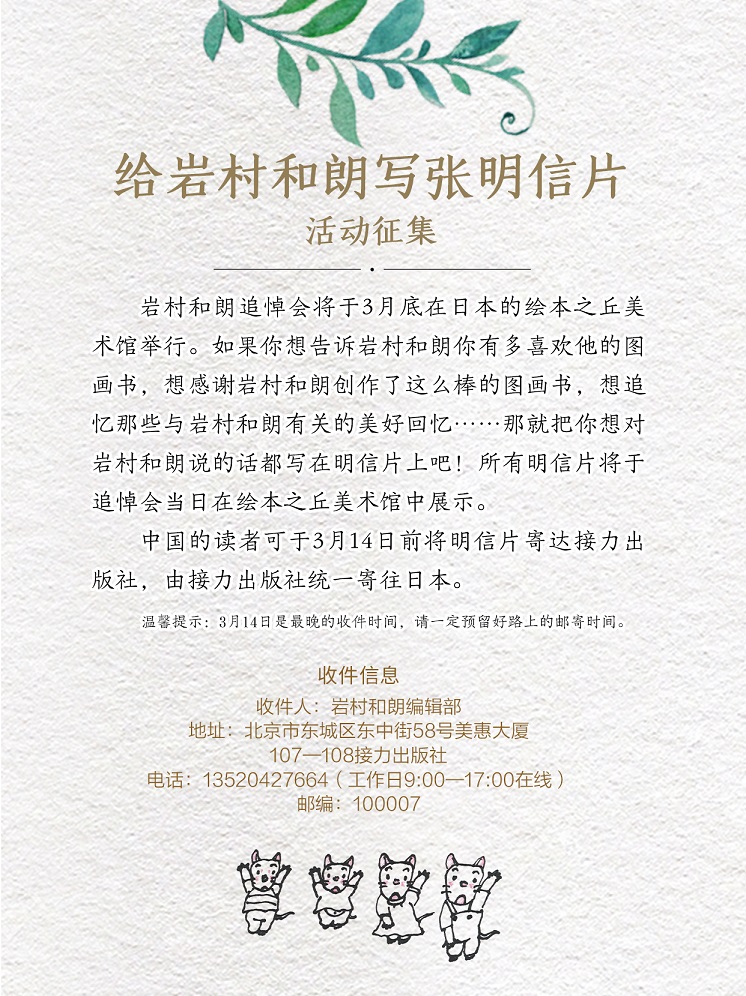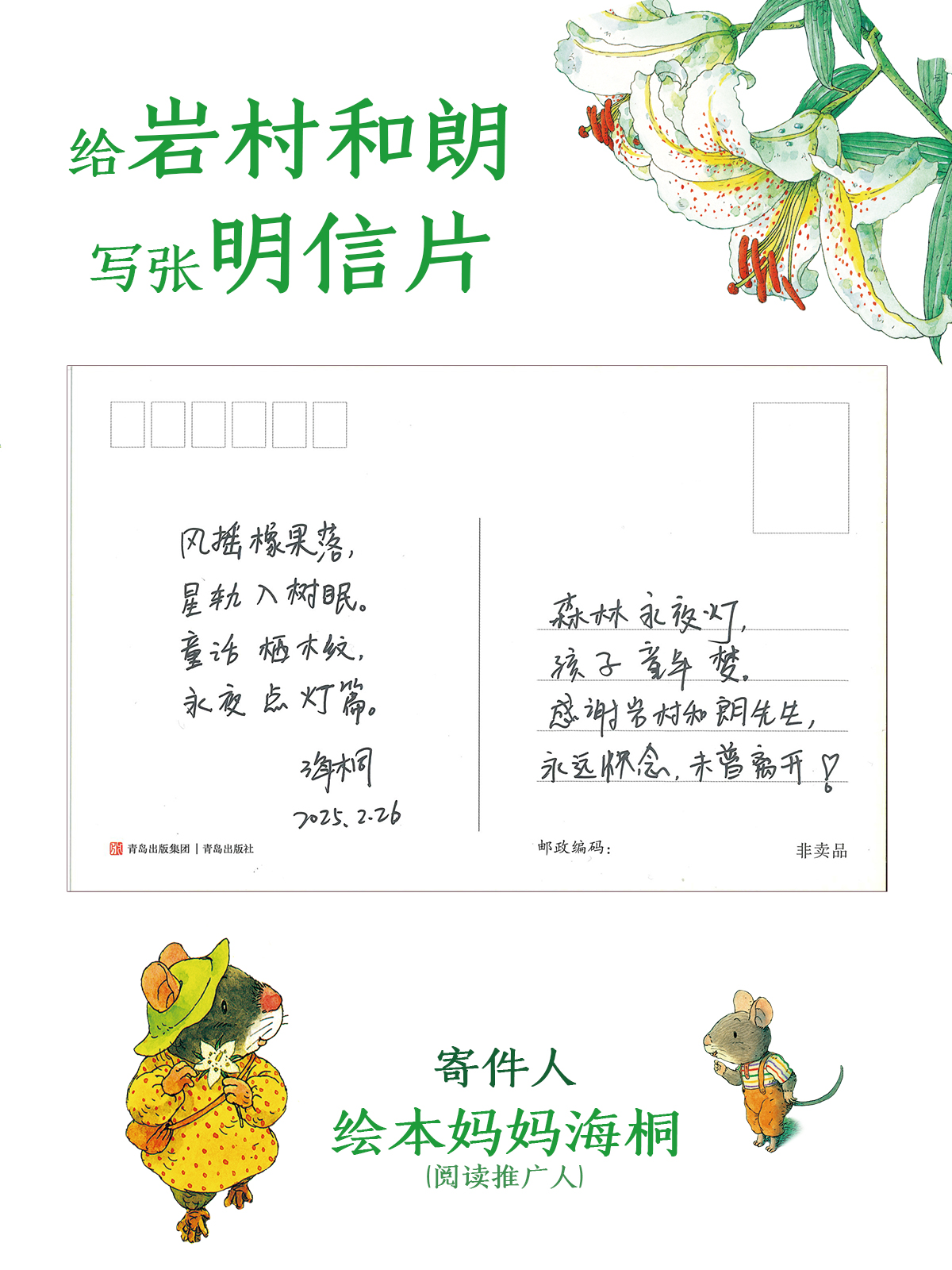 為深切緬懷巖村和朗,接力出版社于2025年2月發起了“給巖村和朗寫張明信片”活動,誠摯邀請廣大讀者通過郵寄明信片的方式,寄托對巖村和朗的無盡追思。