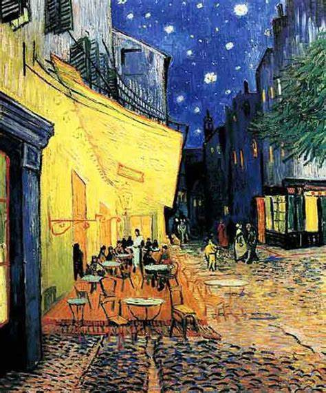 “夜晚的色彩比白天更加生動、更加豐富”。在表現《夜間的露天咖啡座》時,梵高使得咖啡廳明亮的黃色與藍色形成了鮮明的對比。盡管畫的是夜晚,但沒有一絲黑暗,天空是濃郁的藍色,遠處的房屋是深藍色,近處的咖啡館墻面是黃色,露天平臺是橙色,地面則是黃橙色向藍色的過渡。這種鮮艷的色彩和視覺上的強烈對比是阿爾勒賦予梵高的。梵高的早期作品受荷蘭傳統繪畫(如倫勃朗)和現實主義畫派影響,色調以灰暗、深沉為主,常用棕色、黑色和暗綠色,整體氛圍壓抑。如在《吃土豆的人》(1885年)中,畫面以深褐色調為主,僅通過微弱的光線突出人物的質樸與貧困。