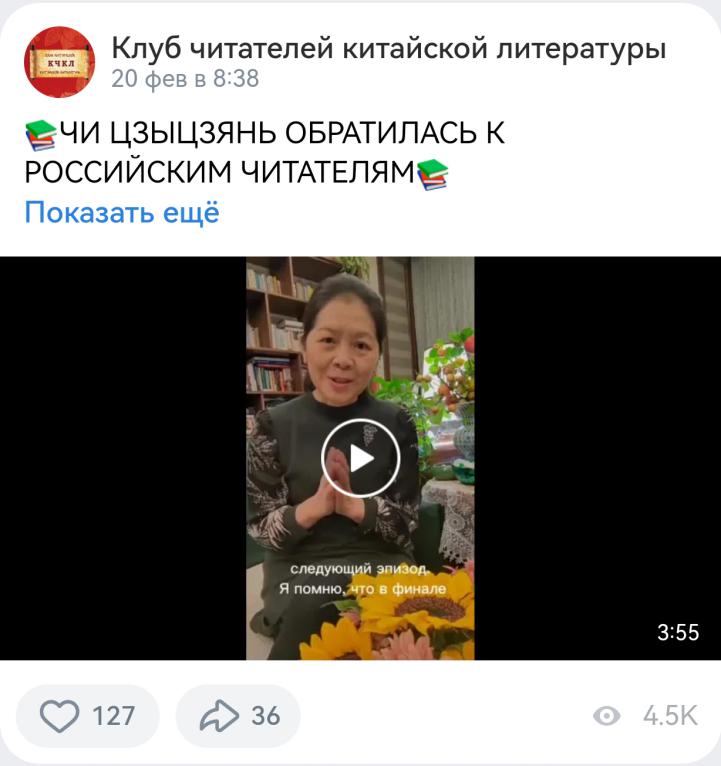 活動結束后,俄羅斯中國文學讀者俱樂部將遲子建女士的致辭視頻和推介會視頻發布在社交平臺上,短短兩天內觀看量已突破4500次,充分展現了俄羅斯讀者對中國文學的濃厚興趣。