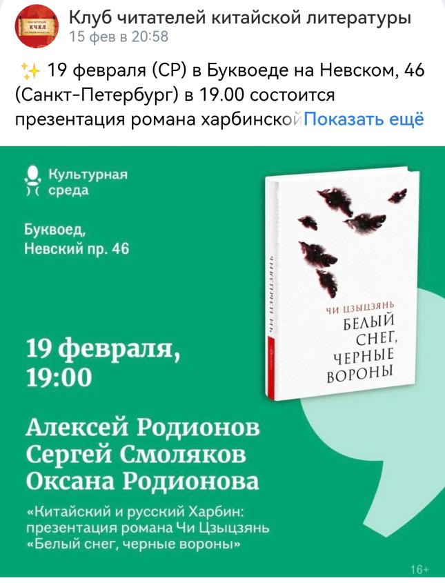 2025年2月19日,中國著名作家、中國作家協會副主席遲子建的長篇小說《白雪烏鴉》俄文版推介會在書蟲連鎖書店圣彼得堡總店成功舉行。本次活動由中國作家協會外聯部指導,俄羅斯中國文學讀者俱樂部主辦,吸引了圣彼得堡各界30余位中國文學愛好者到場參與,同時通過網絡直播向全國讀者推介。