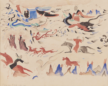 距今約5000年的馬家窯彩陶作為中國史前藝術的瑰寶,承載著先民的智慧和審美意趣,不僅器型精美,其紋樣更是以獨特的視覺語言與藝術形式影響了河西地區乃至中國傳統審美和藝術的發展。展廳一隅,一塊長方形棕色木板雖不起眼,但仔細辨認,其上繪制有山脈、水系、溝溪、關隘、道路、地形等標注的黑色線條清晰可見,這件名為《天水放馬灘木板地圖》的展品便是中國迄今為止發現最早的實物地圖,同時也是世界上最早的實用地圖,簡單的圖示反映了戰國時期秦國邽縣(今甘肅天水一帶)的地理面貌,成為秦人重視實用之學的有力佐證;多幅吳作人、靳尚誼、常沙娜等前輩的敦煌壁畫臨摹作品賦色端莊靜雅、描繪細膩入微,將展廳裝點出獨特的氛圍,正是這般學者、藝術家對敦煌藝術的傾情投入、薪火相傳,千年瑰寶才得以在現代社會中煥發出新的生命力……