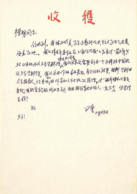 在1980年11月15日,巴金在給姜德明的信中寫道:“創辦一所‘現代文學資料館’,您感興趣嗎?”這是巴金第一次和姜德明談到文學館。