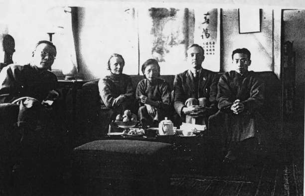 1934年,金岳霖、費慰梅、林徽因、費正清、梁思成(從左至右)在北總布胡同梁、林家中客廳。