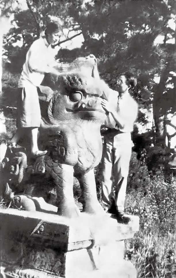 梁思成、林徽因系統調查測繪中國古建和雕刻,是在他們任教東北大學建筑系時從沈陽北陵起步的。有一張照片就是他們兩個正在測繪北陵神道兩邊神獸之麒麟。林徽因騎在麒麟背上,梁思成立在麒麟左前。照片的時間被梁家后人標為1929 年。雖然此時二人都在東北大學任教,但標為1929 年顯然不確。