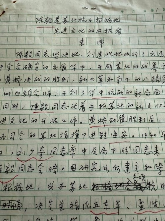 《陳毅是蘇北抗日根據地先進文化的開拓者》手稿,筆者收藏