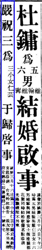 按照杜月笙幼子杜維善的口述,杜家兒女的婚事基本由杜月笙決定,杜維垣很聽父親的話,他也生于1921年,一直在美國讀書,抗戰勝利后學成回國,杜月笙要他跟嚴家小姐結婚,他就奉命結了婚。不過杜維善比杜維垣小12歲,自述戰后杜維垣回國自己才第一次見到他,他婚后不久又走了,以后一直在美國的聯合國文教處工作??梢娦值荛g了解極少。杜維善還說過他二嫂、五嫂都是嚴家仁字輩的,大概是表姐妹或堂姐妹,二嫂結婚后妹妹也嫁到了杜家。這些都明顯有誤。嚴智多女兒嚴仁蕓確實比嚴仁菖小了五歲,但是早一年嫁進杜家。杜維垣一直在美國讀書,戰后拿到教育碩士學位后回國,1947年1月當選為上海嵩山區區長??箲饎倮蠖旁麦显氐缴虾?,由于身體原因又去了香港養病,2月20日,杜維垣飛去香港。當時上海小報報道了這一消息,認為杜維垣是去向父親報告近期上海的商務狀況。同機去港的還有他當時的未婚妻嚴仁菖及其父母嚴智珠夫婦。但其實這次去香港主要是為了辦婚禮。3月9日,杜維垣嚴仁菖結婚。第二天的上海大報上登了杜月笙和嚴智珠聯名宣布的消息: