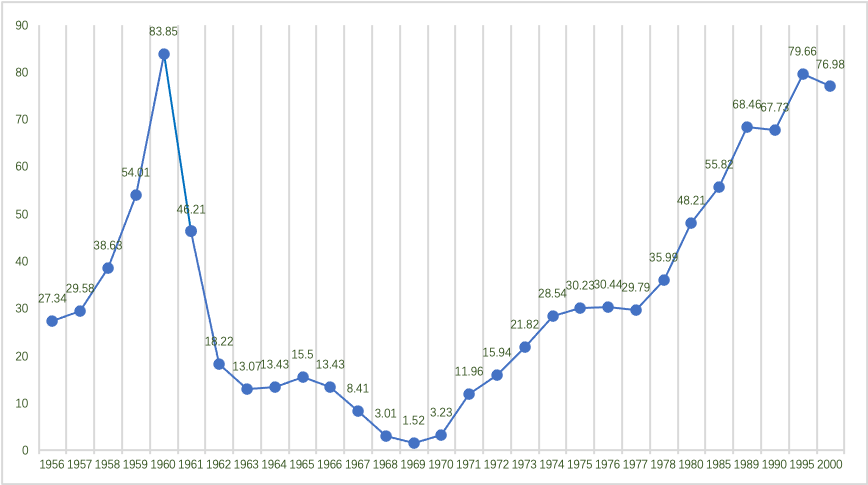 1956-2000年全國中等師范學校在校學生人數統計圖(單位:萬人) 數據來源:申國昌等著:《中國師范教育發展史》,北京:科學出版社,2021年,第226-227、256頁。