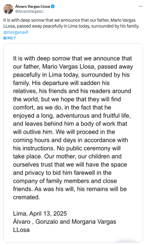 略薩的兒子阿爾瓦羅·巴爾加斯·略薩在社交媒體X上分享的家庭聲明中表示:“我們懷著沉重的心情宣布,我們的父親馬里奧·巴爾加斯·略薩今天在利馬安詳去世,身邊陪伴著家人?!边@位作家的三個孩子補充說,不會舉行公眾儀式,但他們將進行家庭告別。