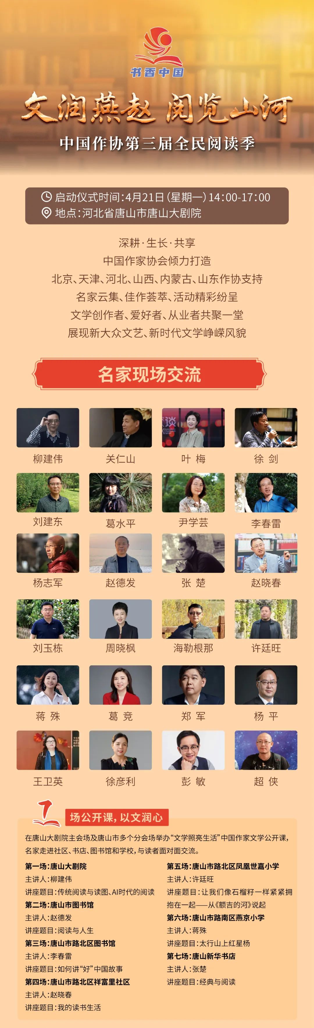 2025年世界讀書日期間,中國作協聯合華北地區北京、天津、河北、山西、內蒙古五省市區及山東省作協,共同舉辦以“文潤燕趙 閱覽山河”為主題的中國作協第三屆全民閱讀季。中國作家網將持續報道,敬請關注。