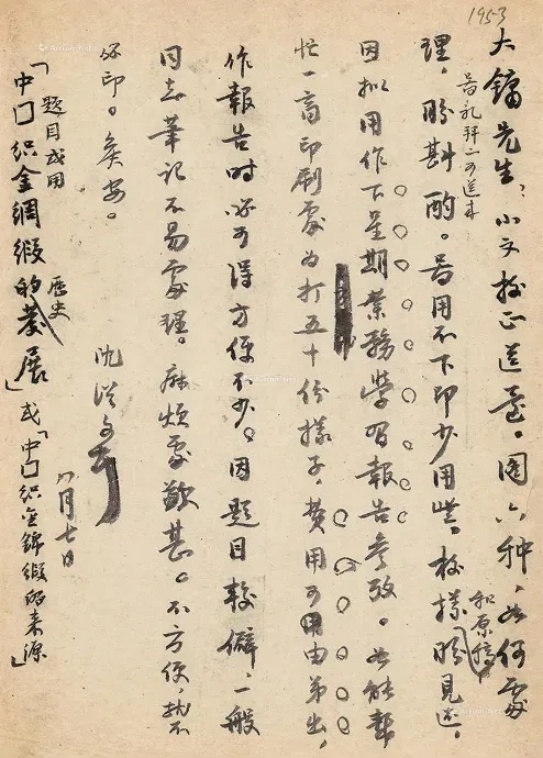 不晤經月,年中祝愿府上長幼體力情緒佳好。弟近因體力似有變化,此后工作一部分恐將放棄,其他若干部分也得考慮重新布置。前托府中小弟所摹珍琉璃圖樣,【近年已擬將全部資料交由一熟人接手去作】小弟或因年終工作正忙,來不及作,盼便中能將上次帶去圖樣,為從郵局寄還,十分感謝。他好意協助此工作,熱心處仍格外深致謝意!依照相熟多年一醫生意見,盡可能在近二月內,不要見友好客人,免在談話中受刺激,□[8]轉惡化,無從補救。所說必有道理。據弟自己估計,一時或不至于忽然報廢。因手邊還有大分量工作,待一一進行,(工作大部分,還屬于文物研究中之真正空白點,北大考古系、或科學院考古所,若容易著手,早已下手,那有我這種文史底子極薄弱的“玩票人”插手余地,正因為工作不易措手,我這外行才能有試探機會?。┤艏创藞髲U,新社會一個公民責任便未盡到,太不合理!但人事倏忽,風雨時來,恐不能凡事憑主觀愿望而定,歷史上有多少遺憾事可以作例!因之,這二月內,大致還是遵醫生建議,除家中人以外,不見任何客人,免家中人耽心病者,過了明年三月,開春后,手足解凍時,若病情不見惡化,還稍有轉機,大致還是將照原來計劃,爭取爭取有限時間,將把已完成、待完成一些大小專題,盡可能一一整理出來,全部上交,似乎才對得起囗家,也才像是個“合格公民”所應盡責任!“成就貢獻”通通說不上,對總的進展,略有些些新的啟發,即在此偉大新社會廿五六年中不算白活矣。