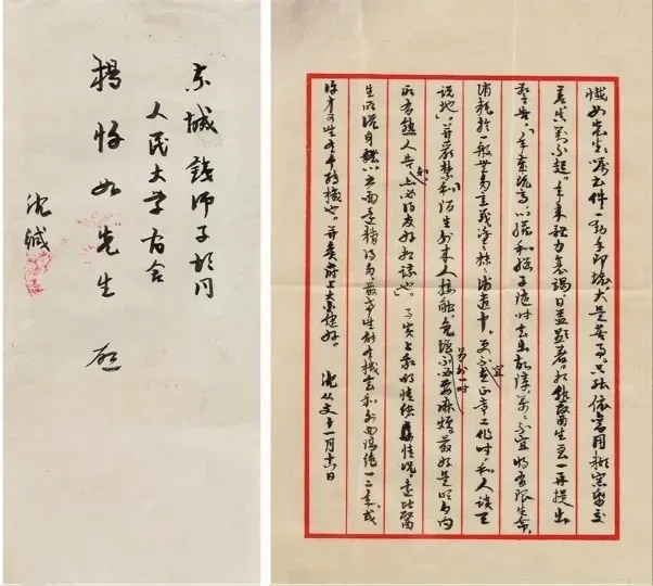 2013年12月12日由北京傳是國際拍賣有限責任公司舉辦的“十周年(2013年)秋季拍賣會”之“‘數風流人物’——近現代文化名人墨跡”專場拍出致楊纖如信二封,2月14日信共二紙,八行箋黑色毛筆豎寫;11月18日信共一紙,八行箋黑色毛筆豎寫。并附信封兩個,收信人信息與寄信人信息分別是“東四北張自忠路舊鐵獅子胡同人民大學宿舍 楊懺如同志”與“東堂子五十一號沈寄”,“東城鐵師子[6]胡同人民大學宿舍 楊懺如[7]先生 啟”與“沈緘”。二信輯校如下: