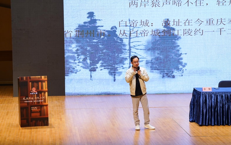 彭敏面向初中生主講《詩詞背后有乾坤》,聚焦古詩詞背后的歷史故事與文化內涵。他打破“標簽化”的詩人形象,通過解析李白、杜甫等詩人的人生軌跡與創作背景,帶領學生理解詩詞中的情感邏輯與人文精神,感受古典文學跨越千年的生命力,引導青少年從詩詞中汲取文化養分。在問答互動環節,彭敏帶來了歷史背后的有趣知識——端午節最初究竟是紀念誰的?屈原吃過粽子嗎?由此鼓勵學生們在閱讀中積極探索,主動追問,培養勤于思考拓展知識的良好習慣。