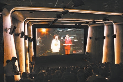 4月19日晚,觀眾在中影國際影城天天中影店觀看話劇《林則徐》“第二現場”直播。