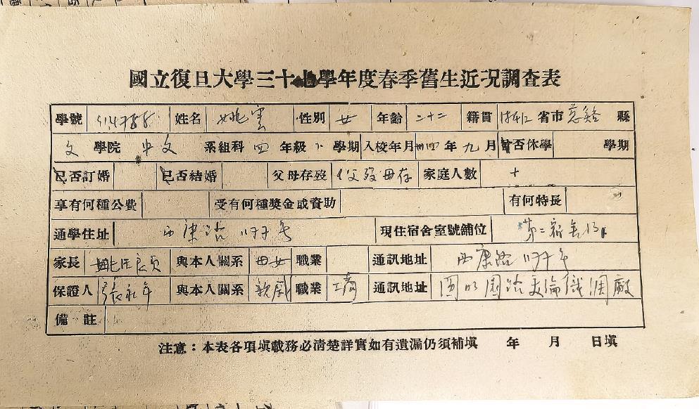 姚云的《學生學籍表》和《舊生近況調查表》,復旦檔案館藏