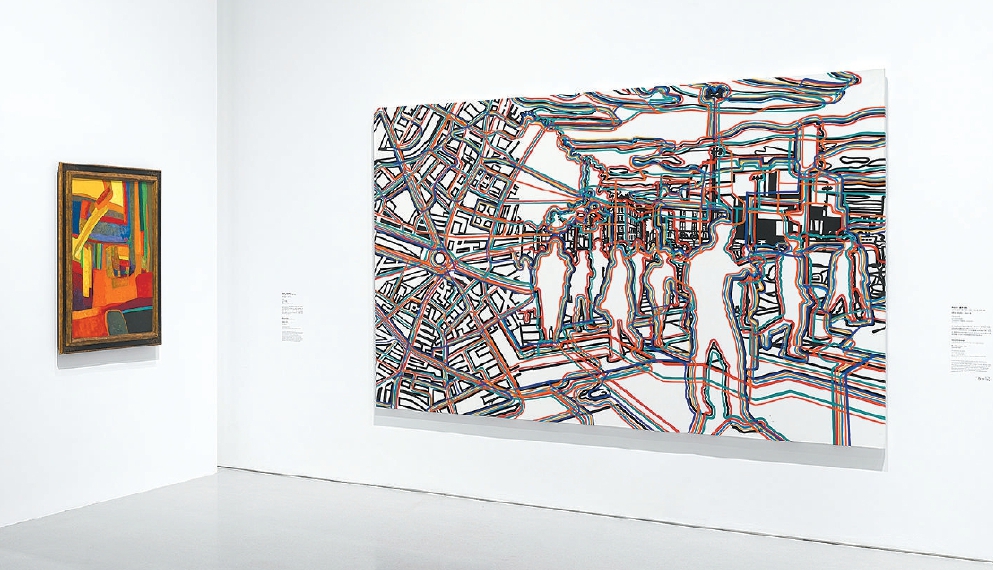 呈現鳥瞰多維視角的“俯瞰之景”板塊,顯得頗為典型??死锼沟侔哺嬖V記者,這些創作對應著飛機發明及普及后給人們視角帶來的顯著變化。例如,讓·杜布菲創作于1944年的《幸福的鄉間》,盡管畫面的彩色方格色塊帶些抽象色彩,但讓人能感覺到田野的邊界,就像在飛機上眺望大地。熱拉爾·弗羅芒熱描繪自己巴黎工作室附近景觀的《巴士底網絡》,創作于2007年,畫面以縱橫交錯的彩色線條勾勒的城市布局,乍一看有些像衛星圖?!扒ъ曛?,智能手機、全球定位系統等新事物都出現了,這幅畫與街區衛星地圖做了一個結合,說明藝術家緊跟時代變化?!?/p>